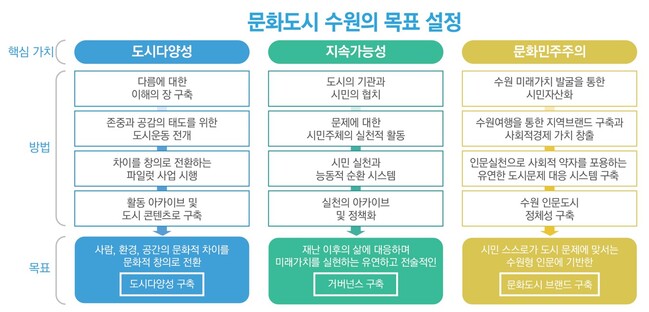 ‘문화도시 수원’의 핵심 가치는 ‘도시 다양성’, ‘지속 가능성’, ‘문화민주주의’이다. ▲사람·환경·공간의 문화적 차이를 ‘문화적 창의’로 전환해 도시다양성을 구축 ▲유연하고 전술적으로 미래가치를 실현하는 거버넌스 구축 ▲문화도시 브랜드 구축 등이 목표다.