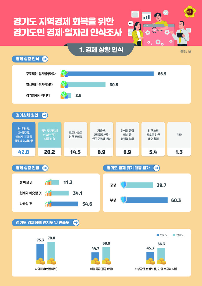 경기도의회(의장 염종현)가 도민의 경제상황 체감도를 측정하고, 주민 맞춤형 경제정책 방향을 설정하기 위해 실시한 ‘2022년 5차 경기도 지역경제 회복을 위한 경기도민 경제·일자리 인식조사’ 결과를 2일 발표했다.