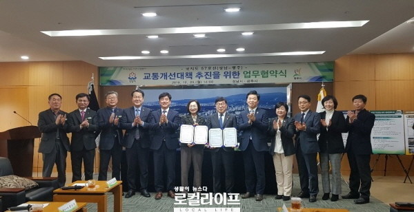 | ▲ ‘국지도 57호선 교통개선대책 추진을 위한 협약식’ 후 참석자들이 기념촬영을 하는 모습. (사진=임현상 기자) |