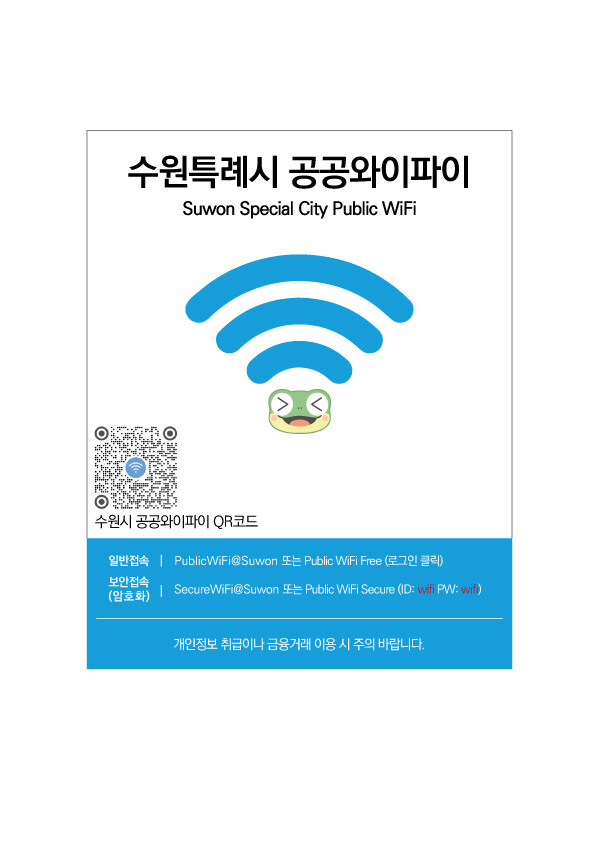수원시는 시민이 더 쉽게 서비스를 이용할 수 있도록 큐알(QR)코드가 포함된 안내 홍보물을 공공 와이파이망 이용 장소에 부착하고, 노후 와이파이 장비도 순차적으로 교체할 계획이다.