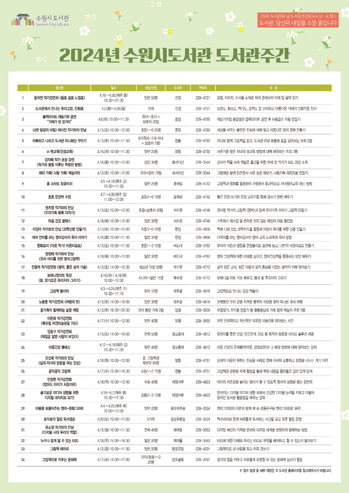 수원시도서관이 제60회 도서관 주간(4월 11~18일)을 기념해 수원시 17개 도서관에서 풍성한 문화행사를 개최한다.