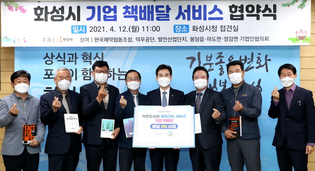 화성시가 지난달부터 개시한 책 배달 서비스 ‘배달on서재’의 활성화를 위해 12일 시청 접견실에서 관내 기업인협의회와 업무협약을 체결했다.