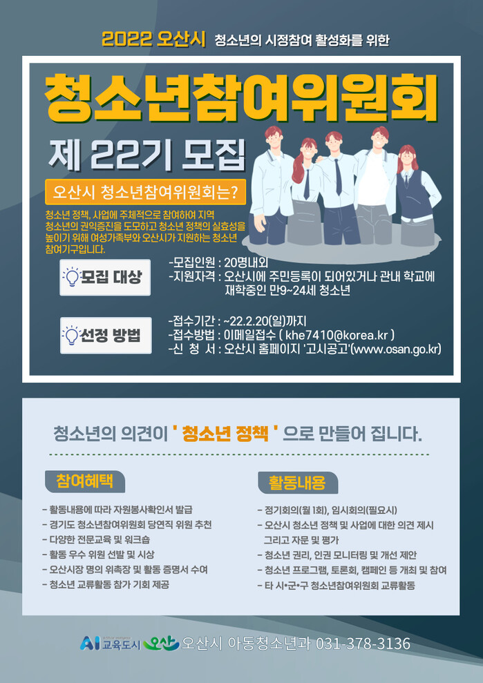 오산시(시장 곽상욱)가 청소년으로 구성된 정책 자문 및 참여기구인‘제22기 오산시 청소년참여위원회 신규 위원’을 오는 2월 20일까지 모집한다고 밝혔다.