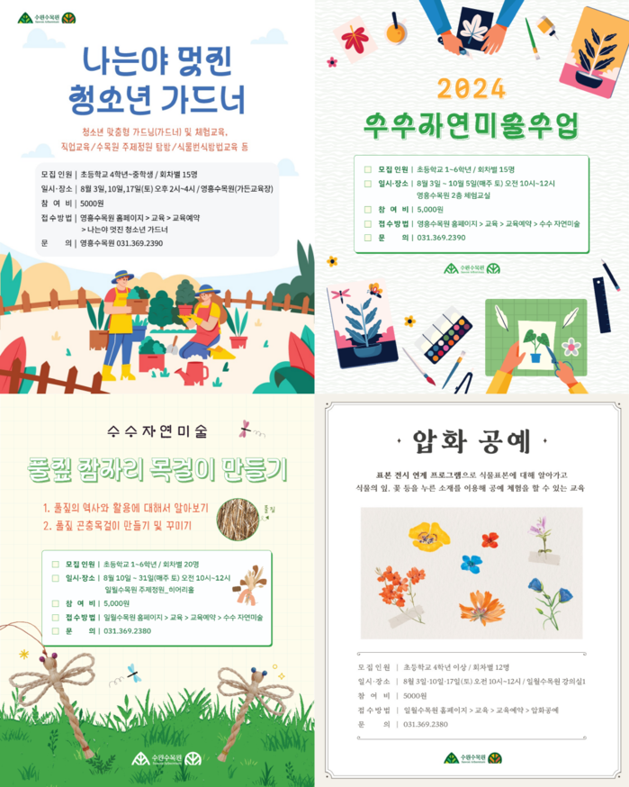 수원수목원이 여름방학을 맞아 8월부터 10월까지 ‘나는야 멋진 청소년 가드너’, ‘수수 자연 미술 수업’, ‘풀짚 잠자리 목걸이 만들기’, ‘압화공예’ 등 다양한 교육프로그램을 운영한다.