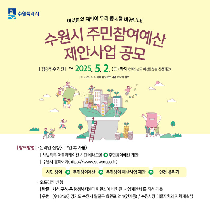 수원시(시장 이재준)가 5월 2일까지 ‘2026년도 예산 편성을 위한 주민참여예산 제안사업’을 공모한다.