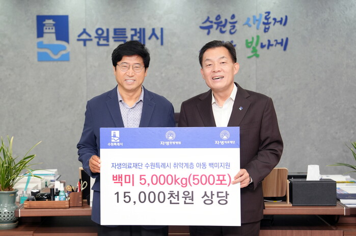 자생의료재단이 “도움이 필요한 아동들에게 힘이 되고 싶다”라며 수원시에 10kg들이 백미 500포(1500만 원 상당)를 기부했다.