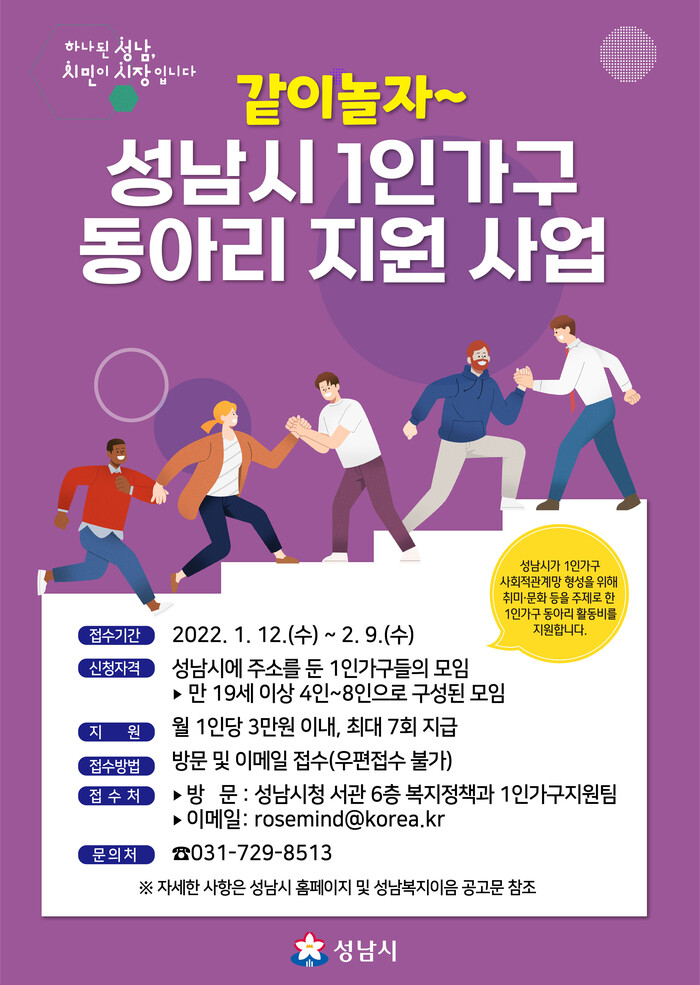 이를 위해 오는 2월 9일까지 ‘같이 놀자~성남시 1인 가구 동아리 지원사업’ 참여 신청을 받는다.