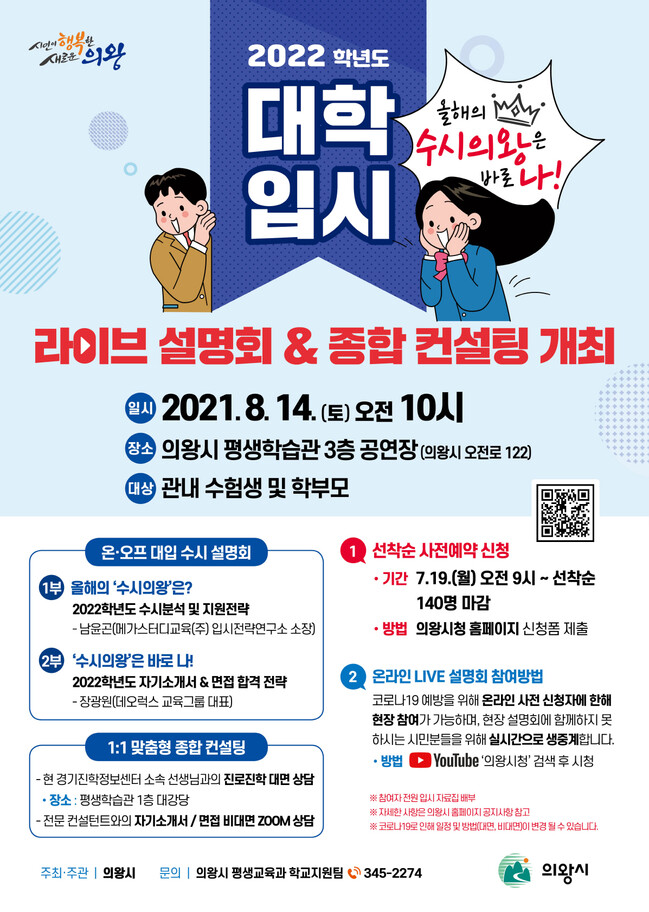 의왕시(시장 김상돈)가 2022년 대학입시 수시 원서접수를 앞둔 수험생과 학부모를 위해 2022학년도 온·오프라인 수시 설명회 및 종합 컨설팅을 개최한다.