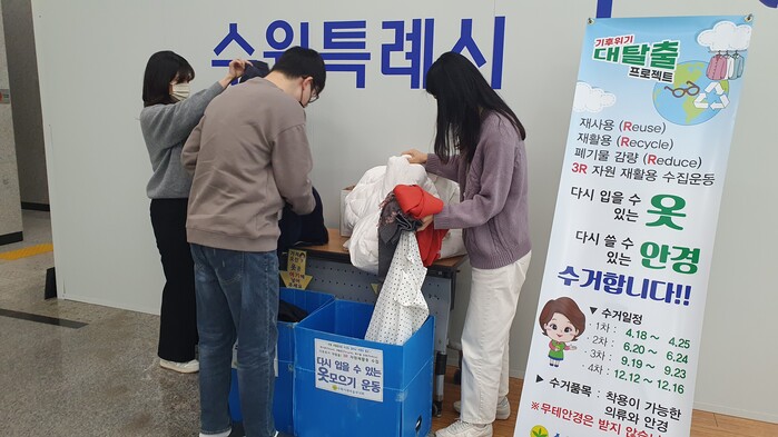헌 옷, 헌 안경 모으기 캠페인은 ‘기후 위기 대탈출 프로젝트-3R 자원재활용 운동’의 하나다. 지난 4월 1차, 6월 2차, 9월 3차 캠페인을 했다. 3R은 재사용(Reuse), 재활용(Recycle), 폐기물 감량(Reduce)을 뜻한다.