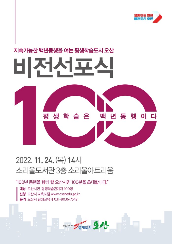 ‘함께하는 변화 미래도시 오산’이라는 시정 슬로건처럼 시민과 함께 학습을 통해 시대변화에 대응하며 앞으로 100년을 준비하고자 하는 이번 평생학습 비전선포식은 특별히‘100년 동행을 위한 100인 초대’라는 컨셉으로 진행된다.