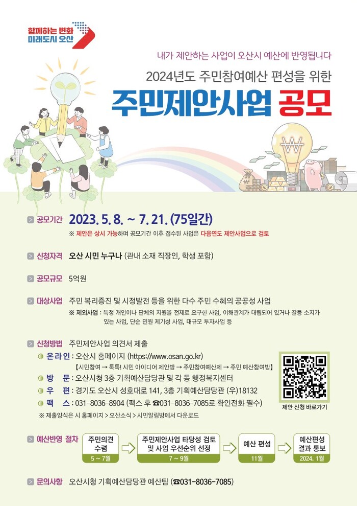 오산시(시장 이권재)는 7월 21일까지 2024년 예산에 반영할 주민참여예산 제안사업 집중 공모를 실시한다고 밝혔다.