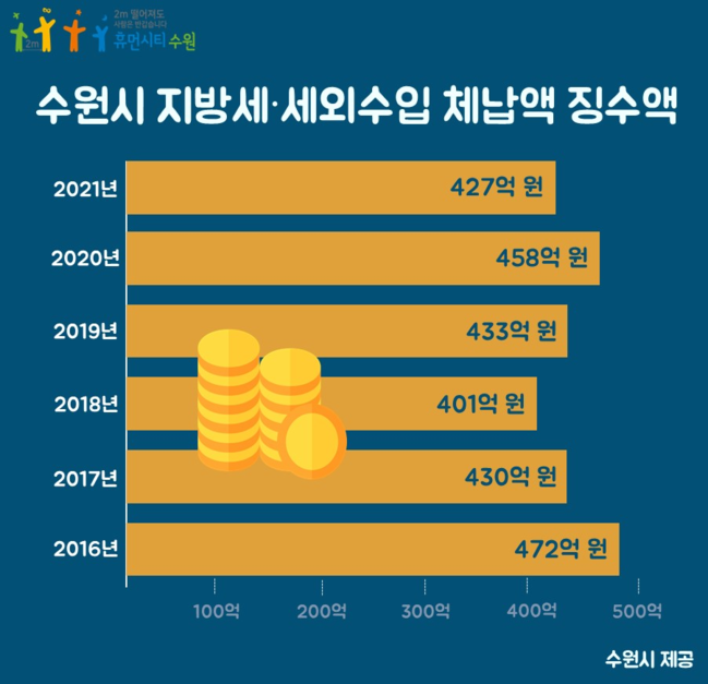 수원시는 2016년 체납액 472억 원을 징수한 것을 시작으로 2017년 430억 원, 2018년 401억 원, 2019년 433억 원, 2020년 457억 원을 징수했다.