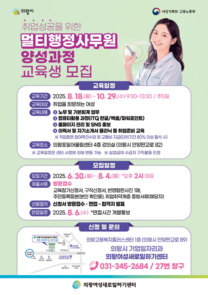 의왕시(시장 김성제) 여성새로일하기센터는 취업 희망 여성들을 대상으로 하는‘멀티행정사무원 양성과정’의 교육생을 모집한다.