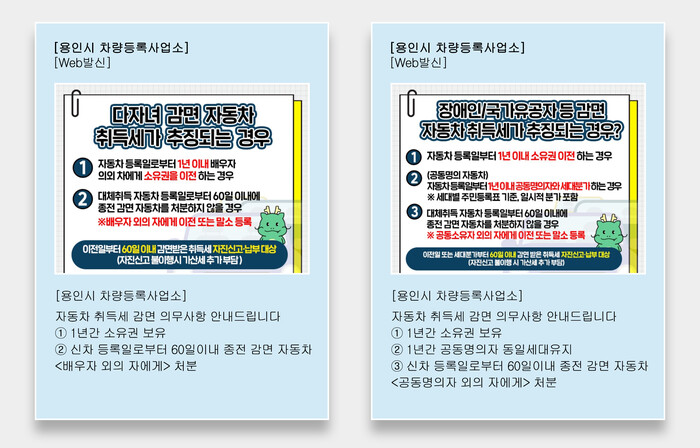 용인특례시(시장 이상일)는 자동차 취득세 감면 혜택을 받은 납세자를 대상으로 의무준수사항 안내를 위해 ‘한눈에 볼 수 있는 조아용 문자알림 서비스’를 추가 도입해 운영하고 있다고 19일 밝혔다.