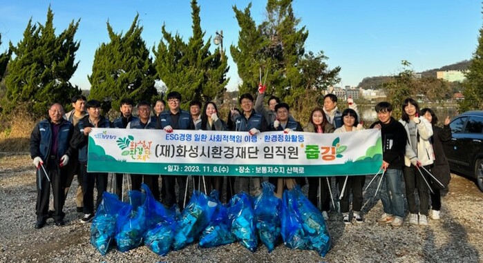 화성시환경재단이 8일 정남면 보통리 저수지 산책로에서 정승호 대표이사를 비롯한 전 직원이 참여해 ‘줍깅’활동을 진행했다.