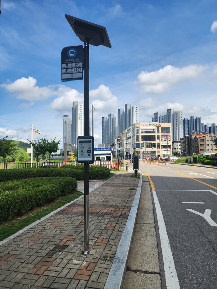버스정보안내기(BIT, Bus Information Terminal)는 버스정류장에 실시간으로 버스 도착 예정 시간을 알려주는 단말기다. 이번에 설치된 결합형 BIT는 태양광 에너지와 저전력 전자종이(e-paper)를 활용해 전기 인입이 어려운 지역에서도 안정적으로 운영된다. 버스 표지판은 자석 방식으로 부착돼 노선 변경 시 손쉽게 교체할 수 있다.