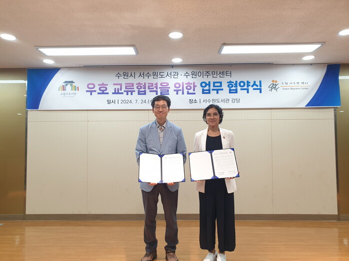 이날 협약식에는 최강구 호매실도서관 관장, 마킨 메이타 수원이주민센터 대표 등이 참석했다.