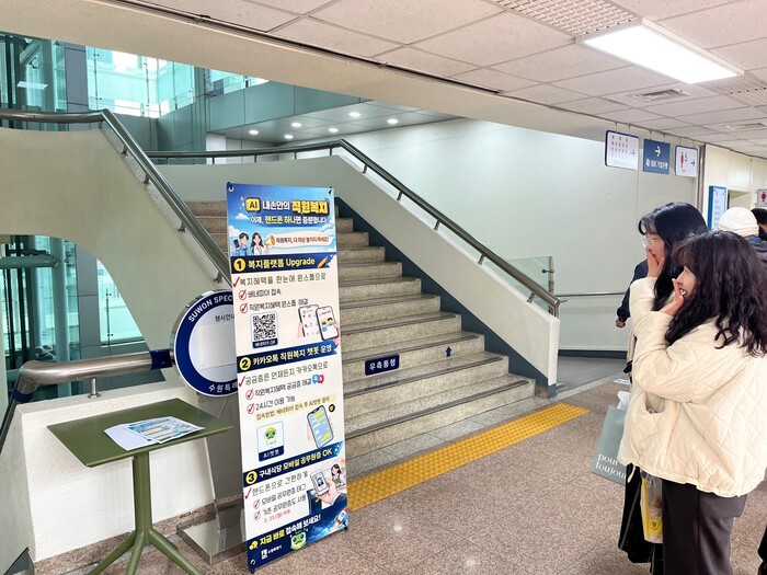 사진/수원시 공직자들이 직원복지통합플랫폼, 인공지능 챗봇 등을 안내하는 홍보물을 보고 있다.(사진제공=수원시)