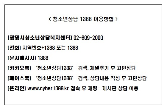 이번 사건·참사를 목격하거나 친구·지인의 상실로 심리적 어려움을 겪고 있는 청소년, 보호자, 교사는 광명시청소년상담복지센터(☎02-809-2000)로 문의하면 상담 서비스를 받을 수 있다. 또한 전화, 모바일, 온라인 등을 통한 청소년상담 1388에서도 24시간 상담 지원을 받을 수 있다.