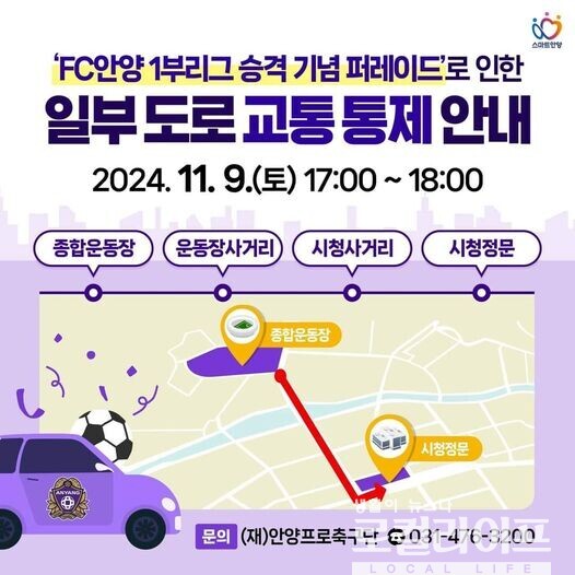 아울러 “퍼레이드 중 일부 도로는 잠시 통제될 예정이니, 여러분의 이해와 양해 부탁드린다”며 “그동안 FC안양에 보내주신 열렬한 응원 덕분에 이 순간을 맞이할 수 있었기에 감사의 마음을 담아 다 같이 축제를 즐겨 보자”고 강조했다.