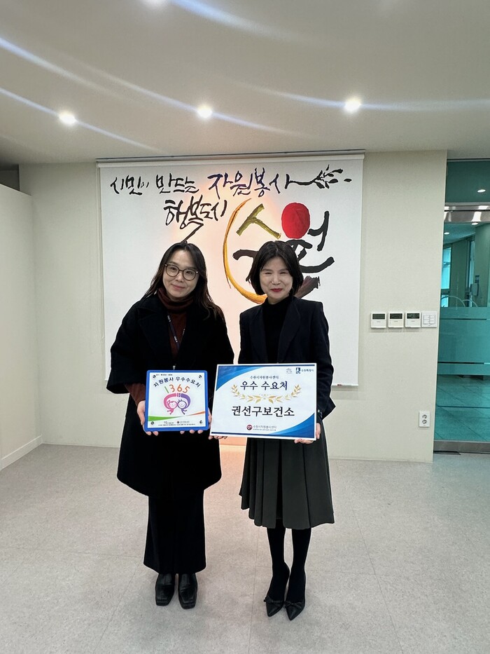 수원시 권선구보건소가 수원시자원봉사센터의 자원봉사 우수 수요처로 지정됐다. 권선구보건소는 26일 수원시자원봉사센터에서 현판을 전달받고, 협력 방안을 논의했다.