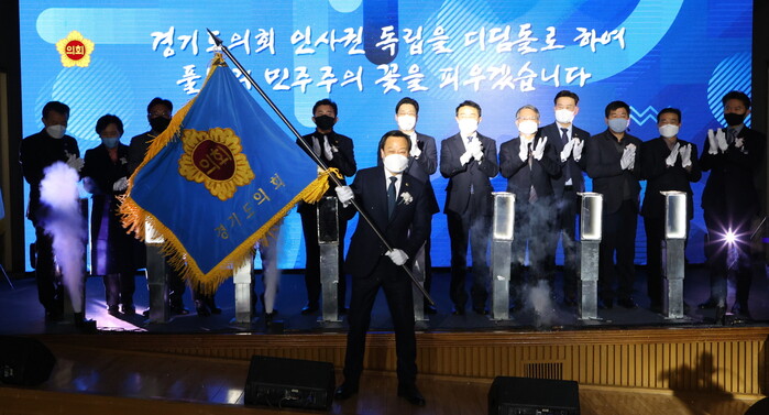이어진 비전선포 세레모니에서 장현국 의장과 초청된 내빈들이 터치버튼을 누르자 LED 전광판에 “경기도의회 인사권 독립을 디딤돌로 하여 풀뿌리 민주주의 꽃을 피우겠습니다”라는 경기도의회 인사권 독립의 비전이 발표됐다.