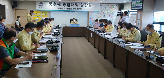 [로컬라이프] 평택시(시장 정장선)는 26일 시장, 국・소장, 유관기관 등 20여명이 참석한 가운데 제8호 태풍 ‘바비’ 북상에 따른 예상진로, 영향범위, 과거 피해내역 등을 공유하고 대처방향과 피해 최소화를 위하여 시장 주재 상황판단회의를 개최했다.