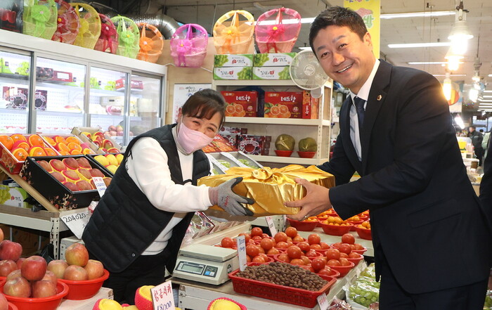 김 의장은 간담회 이후에는 시장 내 상가들을 차례로 찾아 과일, 쌀, 생필품 등을 직접 구매하며, 불안한 경제 상황에 답답함을 토로하는 상인들을 격려하는 시간을 가졌다.