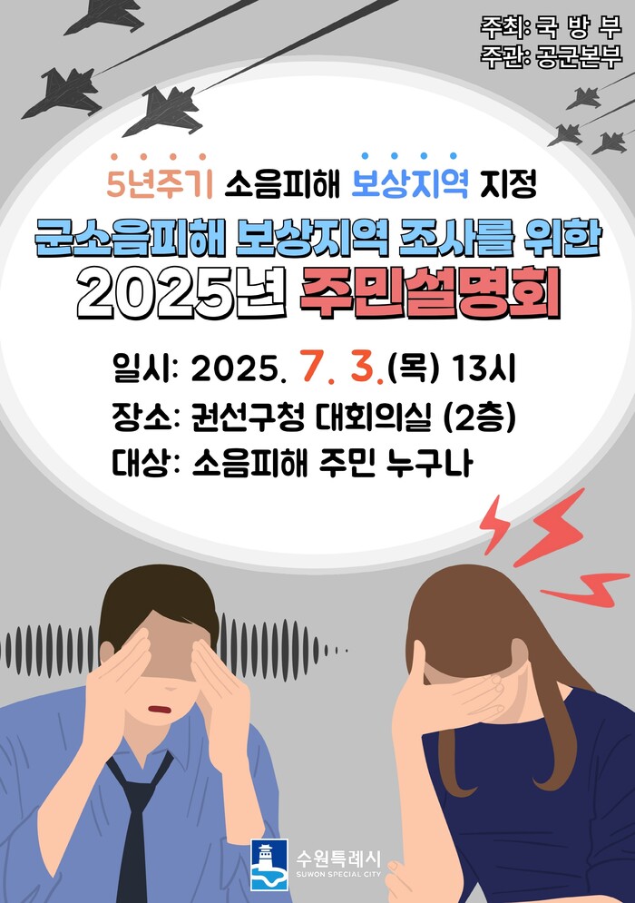 국방부가 주최하고 공군본부가 주관하는 ‘수원 비행장 군 소음 피해 보상 지역 조사(소음영향도 조사) 사업’ 주민 설명회가 3일 오후 1시부터 5시까지 권선구청 2층 대회의실에서 열린다.