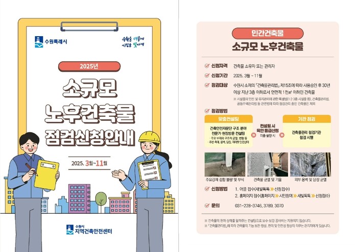 수원시 관계자는 “소규모 노후건축물 안전 점검으로 시민 불안감을 해소하고 건축물의 지속적인 유지·관리를 유도할 계획”이라며 “건축 안전사고 예방을 위한 지원을 확대해 나가겠다”고 말했다.
