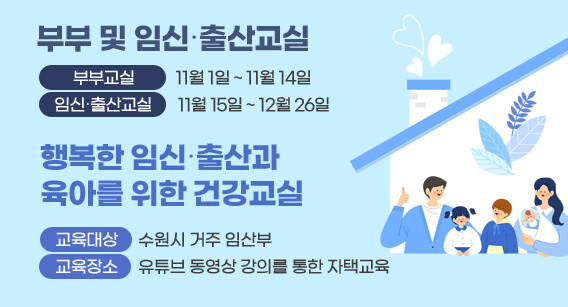 자세한 내용은 수원시 보건소 홈페이지(https://health.suwon.go.kr) ‘보건소식’에 게시된 ‘행복한 임신·출산과 육아를 위한 건강교실 안내’에서 볼 수 있다.
