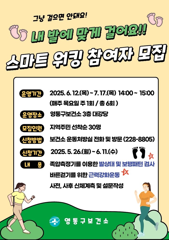 수원시 영통구보건소가 5월 26일부터 6월 11일까지 지역 주민을 위한 맞춤형 걷기 교육 프로그램 ‘스마트 워킹 운동교실’의 참여자를 모집한다. 주민들의 건강한 운동 습관 형성과 비만 예방을 지원하는 프로그램이다.