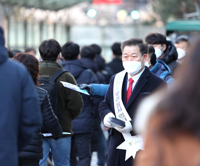 [로컬라이프] 박승원 광명시장은 9일 이른 아침 철산역에서 ‘설 명절 방역수칙 준수 거리 캠페인’을 벌여 시민들에게 안전한 명절 보내기를 당부하고 설 명절 인사도 함께 전했다.