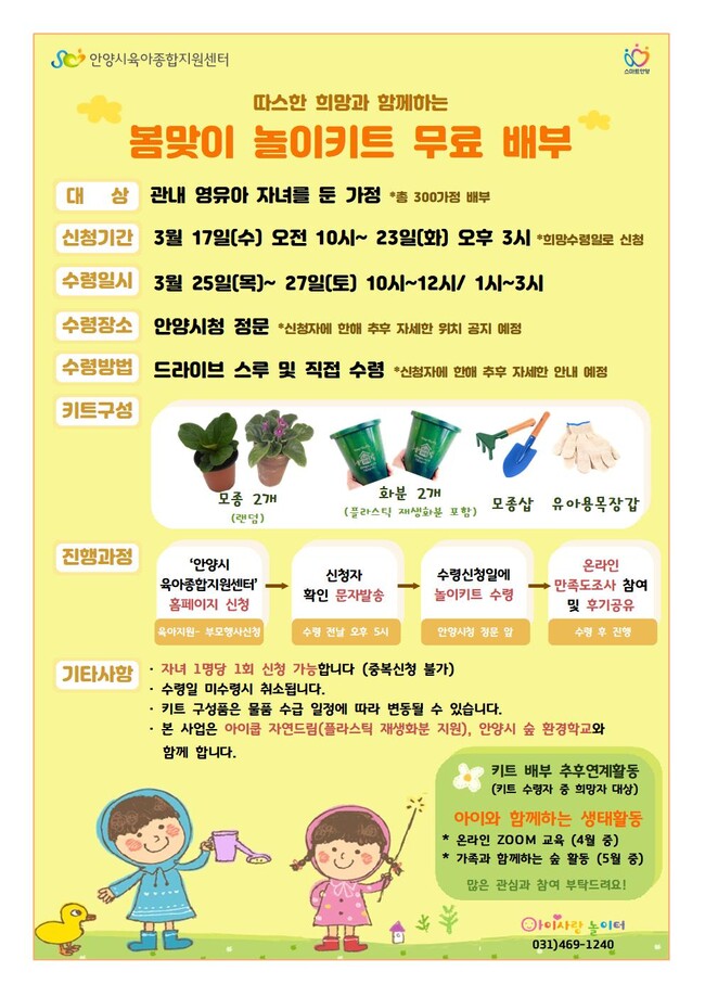 안양시가 집안에서 재배의 성취감을 맛볼 수 있는 봄맞이 놀이키트를 무료 배부한다고 8일 밝혔다. 만5세 이하 영유아를 키우는 가정을 대상으로 한다.