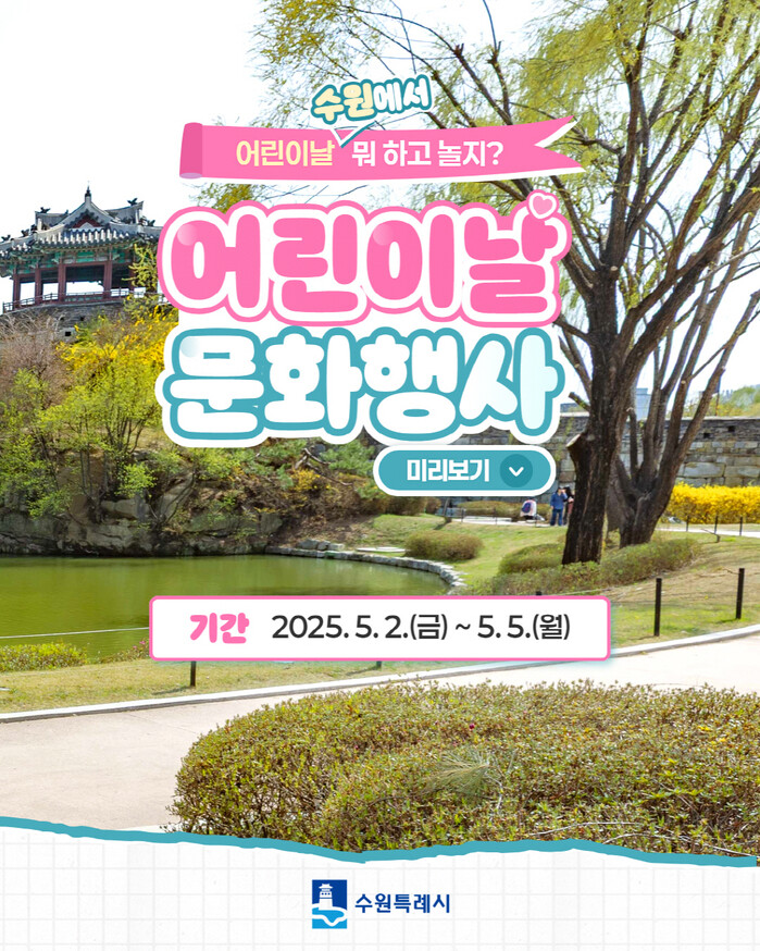 수원시 관계자는 “어린이와 가족이 함께 추억을 만들 수 있는 즐거운 축제를 준비했다”며 “많은 시민이 다양한 행사에 참여해 즐겁고 안전하게 어린이날을 보내길 바란다”고 말했다.