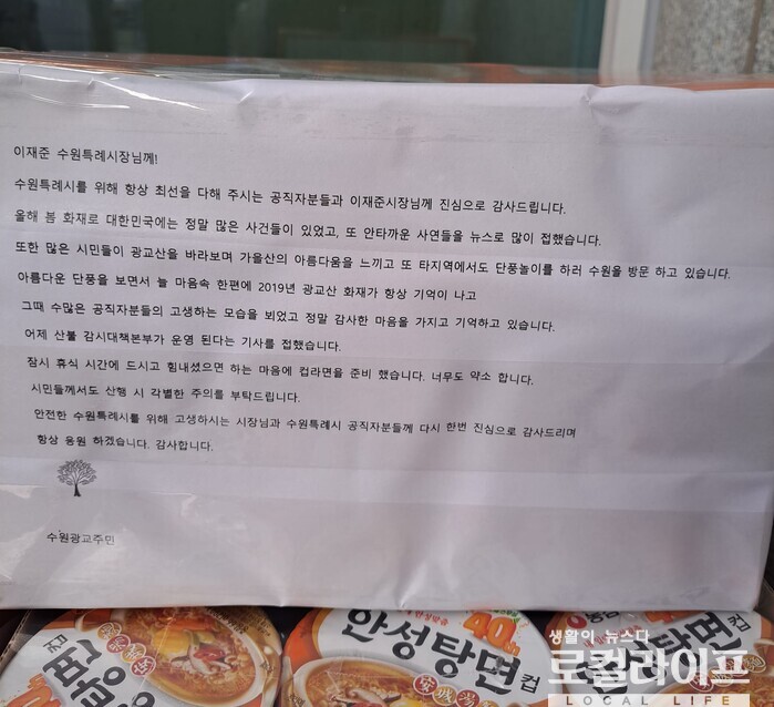 이재준 시장은 “오늘(3일) 새벽 시청사 중앙현관에 정체 모를 컵라면 39상자가 쌓였다. A4용지에 반듯하게 인쇄된 사연이 남다르다”며 “2019년 광교산 산불 때 불 끄느라 고생하던 공직자들을 기억하신다며 늘 감사한 마음을 갖고 계셨단다. 그리고, 올가을 우리 시가 산불방지대책본부를 운영한다는 기사를 접하시고 본부에서 일하는 공직자들을 위해 간식을 준비하셨다고 한다”고 밝혔다.