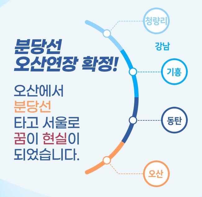 곽상욱 시장은 이날 자신의 페이스북을 통해 '시민 여러분 축하드립니다. 함께 꾸었던 꿈이 현실이 되었습니다'라며, 4월 제4차 국가철도망 구축계획(21년~30년) 공청회에서 반영되었던 분당선 연장 계획이 드디어 확정 되었다고 전했다.