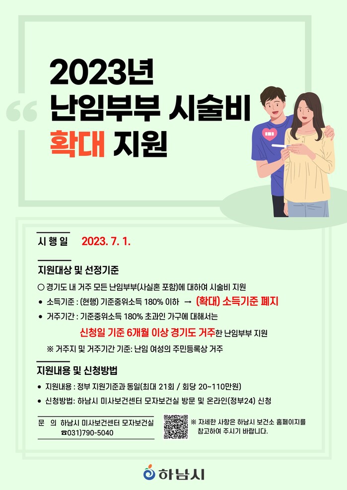 하남시 난임부부 시술비 예산은 기존 ‘정부형’ 난임지원사업 예산 12억 4천만원이었으나 이번에 ‘경기도형’ 난임지원 예산 2억 3천만원이 추가 반영돼 총 14억 7천만원으로 확대될 예정이다.