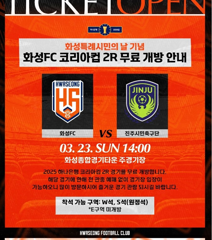 화성특례시(시장 정명근)가 화성특례시민의 날을 맞아 오는 23일 화성종합경기타운 주경기장에서 열리는 화성FC와 진주시민축구단의 ‘2025 하나은행 코리아컵’ 2라운드 홈경기를 무료로 관람할 수 있는 혜택을 제공한다.