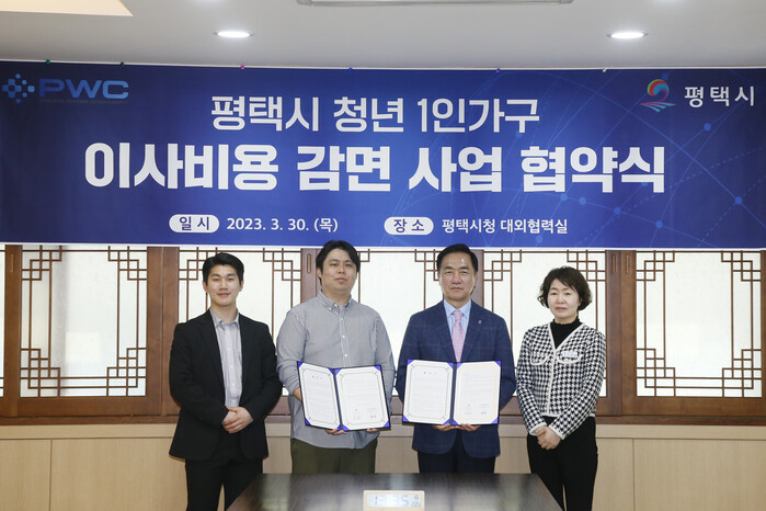 평택시(시장 정장선)는 청년의 주거비 부담을 덜어주기 위해 30일 PWC청년물류기업과 청년 1인 가구 이사비용 감면 사업 업무협약을 체결했다.