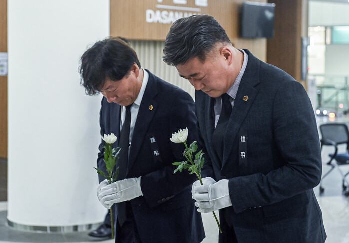 김정호 국민의힘 대표의원이 남종섭 더불어민주당 대표의원과 함께 26일 경기도청 1층 로비에 마련된 ‘화성 공장 화재 희생자 합동분향소’를 찾아 헌화하고 묵념했다.