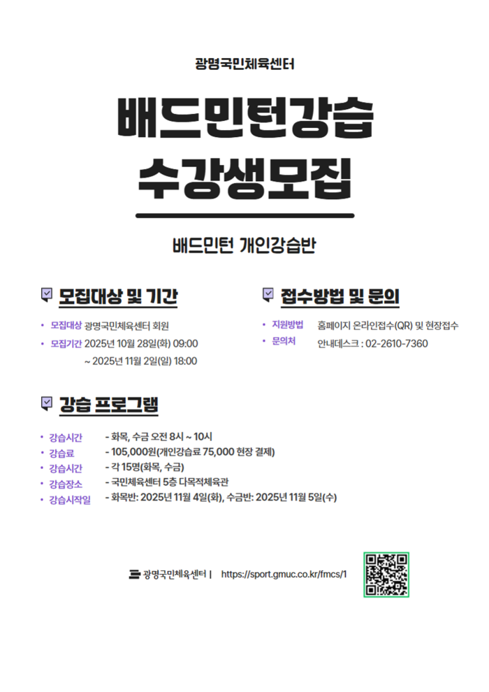 광명도시공사(사장 서일동, 이하 공사) 광명국민체육센터가 시민들의 꾸준한 생활체육 수요와 배드민턴에 대한 높은 관심을 반영해 배드민턴 개인강습 프로그램을 신규 개설한다.