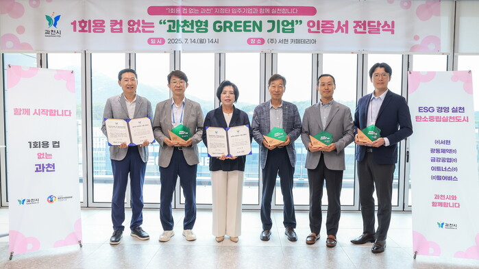 과천시는 7월 14일 ㈜서현 사옥 10층에서 ‘과천형 GREEN 기업 인증서’ 전달식을 열고, 다회용 컵 사용 등 친환경 실천에 앞장선 5개 기업을 선정해 인증서를 수여했다.