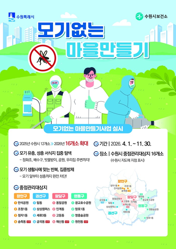 수원시보건소가 올해 ‘모기 없는 마을만들기’ 사업 대상지를 16개소로 확대 운영한다.