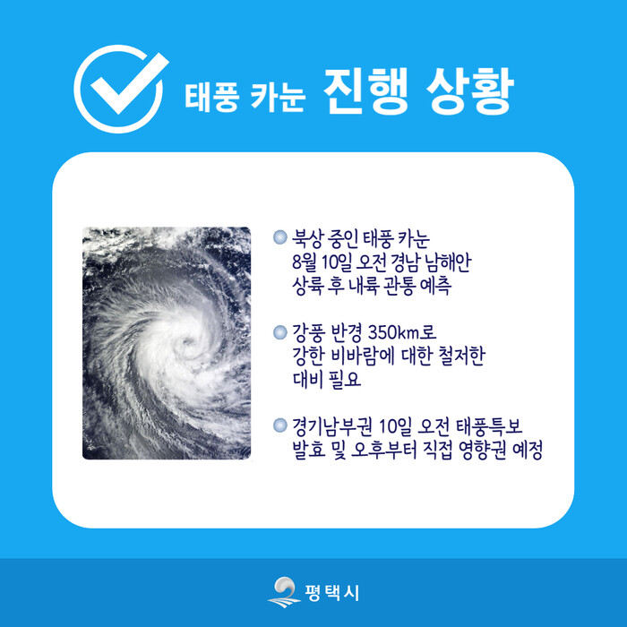 이와 관련해 정장선 평택시장은 8일, 자신의 페이스북을 통해 기상청 예보에 따르면 모레 아침인 10일 오전부터 수도권을 포함한 우리 지역도 태풍 영향권에 들어설 전망이라고 밝혔다.