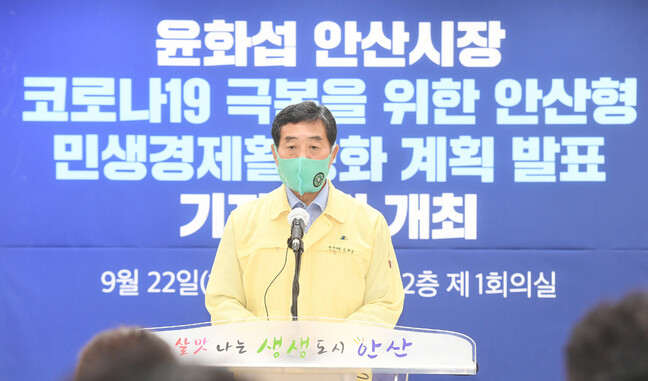 사진/윤화섭 시장 “소상공인 생활안정지원 147억 원 투입”(윤화섭 시장이 지난해 9월22일 2차 안산형 생활안정지원금 지급 계획을 알리는 기자회견을 하고 있다 (사진제공=안산시)
