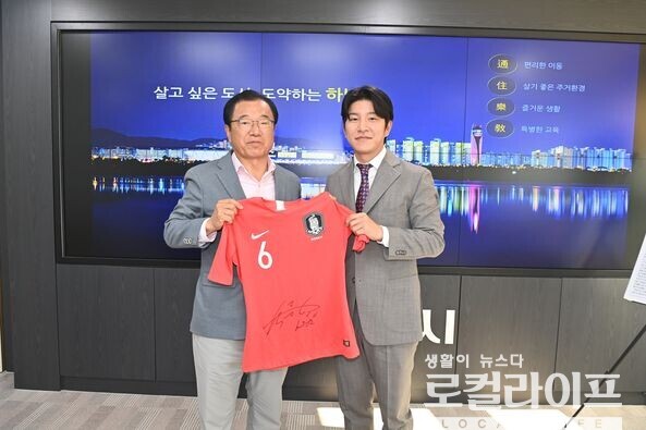 | ▲ 이현재 하남시장(왼쪽)이 박주호 선수(오른쪽)로부터 유니폼을 기증받고 있다. (사진출처=이현재 페이스북) |