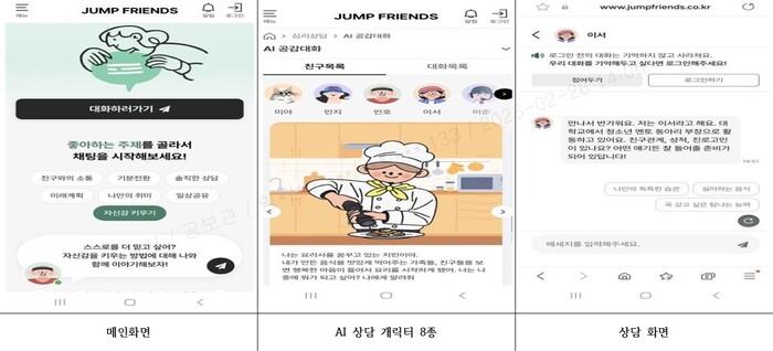 3월 25일 운영을 시작한 JUMP FRIENDS(www.jumpfriends.org)는 생성형 AI(인공지능)를 활용해 고위험 고립 위기 청(소)년에게 대화와 유사하게 느껴지는 공감상담 서비스를 제공하는 것이다.