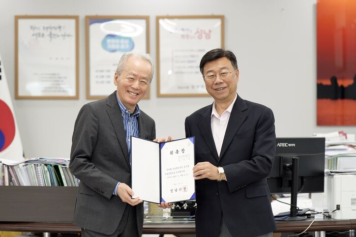 신상진 성남시장이 3일 오후 시청 집무실에서 성남시립교향악단 예술총감독인 금난새 지휘자를 성남물빛정원 음악홀 명예 예술감독으로 위촉했다.