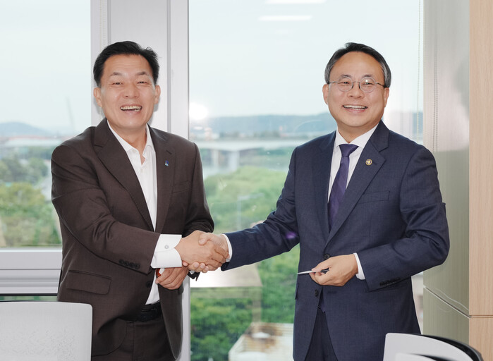 사진/이재준 수원시장(왼쪽)과 고기동 차관이 악수를 하고 있다.(사진제공=수원시)